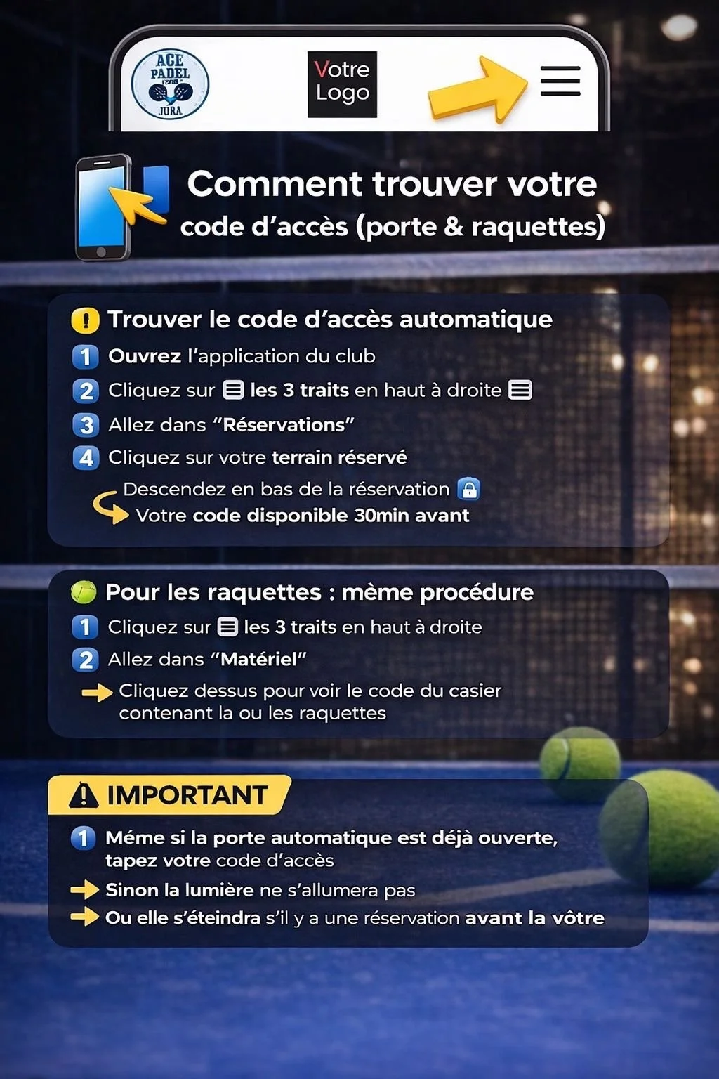 Créez votre compte perso sur l’application ACE PADEL JURA ( à votre nom).